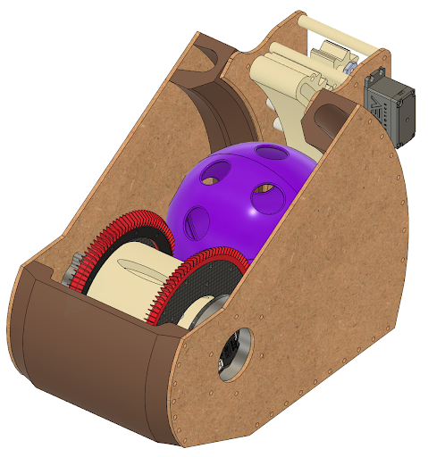 This is v1 of our actual launcher. With this iteration we’ve moved away from the large testing rig and over to a smaller and more standard launcher design/formfactor. Since we are still in the testing phase we’re continuing the use of MDF due to it being cheap and easy to manufacture with. For large parts that are highly subject to change we’re using PLA. Testing from our v0 launcher, and physics in general, we decided to continue to use a 45 degree angle for our launcher due to it being the middle-ground for max x and y displacement. Launcher v1 uses our new and improved v2 flywheel (check out that blog post for more info!). Additionally, it features an adjustable hood in order to control the launch angle and has side guide rails in order to introduce increased compression for more powerful shots.