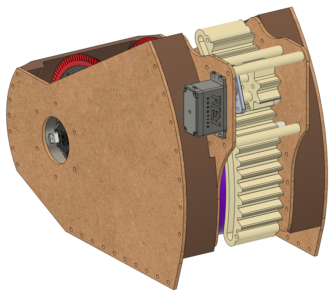 The test results for v1 revealed some glaring issues and confirmed our suspicions about certain possible problems. First of all, we knew we would have issues with launch power due to the shorter distance for which the artifact was in contact with the flywheel compared to the v0 launcher. Slow motion videos revealed that a lot of the energy was going into ball spin instead of forward velocity. Additionally, a lack of ball compression could be playing a major role in this issue. Secondly, immediately after finishing the build for this version of the launcher we could tell that we had not designed the hood properly. Its installation was more complicated than it should have been. It was also far too flimsy, didn’t quite work as intended, and added a lot of bulk to the back of the launcher. Once we realized our errors with the hood, we decided it would be best to remove it in the meantime, especially as there was no real benefit in having it due to varying the flywheel speed performing essentially the same task with less mechanical complexity.